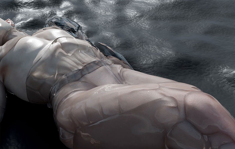 Naviguant entre fantasy et science-fiction, il donne forme à cette utopie dans Mirari : une vie retrouvée, vidéo dans laquelle il se représente en avatar elfique, dormant paisiblement dans un paysage de cendres, le corps nu, une armure de verre comme unique protection. Seul et vulnérable dans l’infini numérique, sa voix métallique scande un psaume qui invite à l’introspection, à l’acceptation des sensations et des émotions, à leur sublimation. On saisit alors la dimension autoportraitique de l’œuvre : derrière la virtualité de la scène, l’artiste lève en réalité le voile sur sa poïesis mue par l’hypersensibilité, un mouvement de soi vers les autres. Il donne à voir et à ressentir les possibles permis par l’état hypersensible, qu’il célèbre dans cette exposition comme une urgence salvatrice de notre humanité. « Enlace-toi de ces entrailles. Cette forteresse infinie : c’est pour toi ».