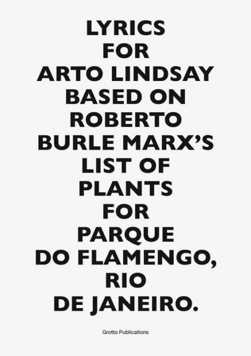 - Sophie Nys, Lyrics for Arto Lindsay based on Roberto Burle Marx’s list of plants for parque Do Flamengo Rio de Janeiro, Grotto Publications, Bruxelles, 2011