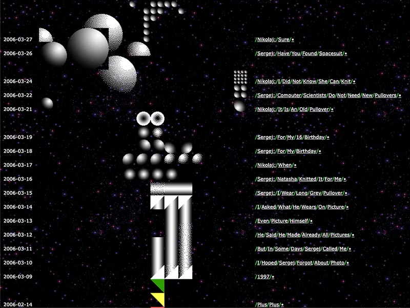 Commissaires d’exposition ou collectionneurs d’art, nous voulons croire les artistes jusque dans leurs histoires les plus invraisemblables. Comme nous le faisons face aux tirages du corpus Frozen Niki d’Olia Lialina & Dragan Espenschied. Ces mêmes tirages pérennisent le contenu du blog personnel de Nikolaj Osinin qui, à en croire les deux artistes, compte parmi les membres d’un voyage intergalactique en direction des lointaines galaxies des nuages de Magellan. Cryogénisé pour l’occasion, son activité cérébrale est enregistrée par un serveur du cosmodrome de Baïkonour comme son blog en témoigne. N’est-ce pas là une illustration du formidable potentiel des images, tant à circuler qu’à nous faire voyager en cette troisième révolution industrielle que les artistes aux pratiques aventureuses savent si bien documenter.
