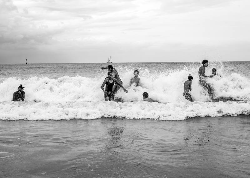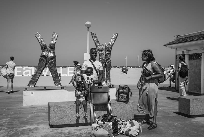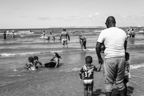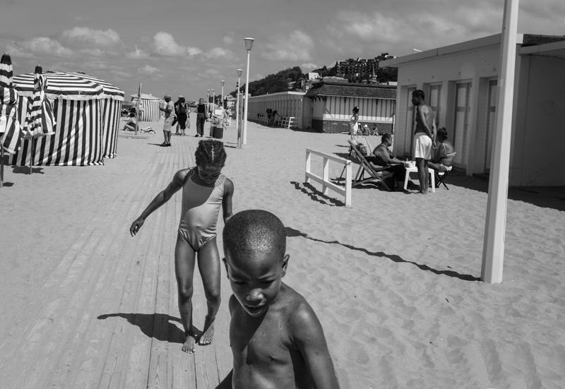 Alain Nahum nous fait partager la joie de la découverte de ces nouveaux espaces, libres et vivants, le plaisir des jeux d’eau, du partage avec la famille, les enfants. Il n’est pas un photographe humaniste, c’est un photographe humain. Sans voyeurisme, il montre subtilement l’intime et le désordre du monde. Sur les plages bien policées de Deauville, ces photos donnent l’impression d’un autre continent. Sur place, il s’est vu reproché de photographier ces baigneurs·euses, majoritairement noirs·es, pourtant il faut rendre compte de cette ségrégation cachée, et être capable de photographier le plaisir et la joie.