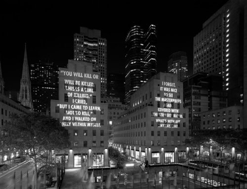 L’artiste américaine Jenny Holzer (*1950, vit à New York) se sert dans son travail essentiellement de textes qu’elle introduit sous forme de visuels dans l’espace public afin d’interpeller le spectateur. Elle se revendique elle-même comme artiste publique. Selon elle, l’art doit non seulement être dans la rue, mais doit aussi utiliser les moyens de communication les plus visibles, afin d’être perçu par le plus grand nombre de personnes les plus différenciées.