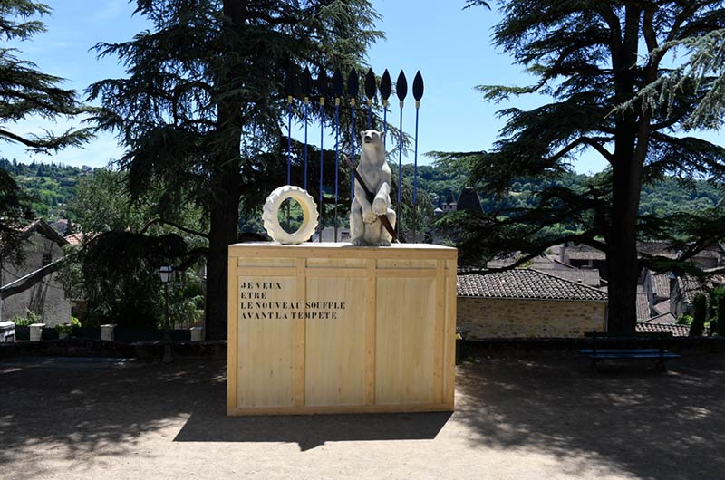 VK : Il y a une grosse caisse de transport en bois. Comme celles qui voyagent les gros objets industriels. Sur cette caisse, il y a une signalétique. Dont le titre de l’exposition : « je veux être le nouveau souffle avant la tempête ». Au sommet de cette caisse il y a la sculpture d’un ours polaire debout. Il tient au creux de ses pattes antérieures une hélice en bois de petit avion. Cet ours se présente là debout devant une série de lances de guerre érigées verticalement qui forment une sorte de rempart. Ces lances sont recouvertes en partie d’une peinture thermo chromique : c’est-à-dire qu’elles changent de couleur en fonction de la température ambiante. Nous devrions donc les voir évoluer si les températures estivales de 2019 s’approchent de la canicule... On a donc un ours polaire qui est l‘animal emblématique du changement climatique qui voit son territoire fondre et disparaître. Les lances ce sont la rhétorique de la guerre qu’il faut mener contre le capitalisme prédateur responsable de cette situation. La caisse de transport en bois c’est le symbole de la mondialisation, avec ce monde ouvert aux échanges commerciaux intensifs. L’horizon que l’on nous a promis comme étant désirable. L’hélice, c’est d’une part l’imaginaire des transports et l’ère de la puissance que nous ont conféré les énergies fossiles. Je vois ce monument comme un objet de prospective : c’est le monument qui sera érigé dans le futur, quand nous n’aurons plus de pétrole, plus d’avions, plus d’ours polaire, plus d’agriculture destructrice, etc.
