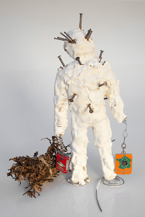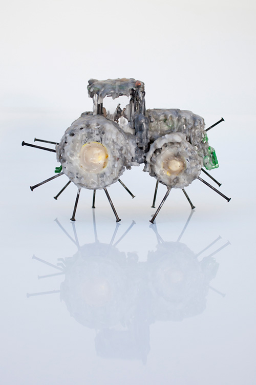 VK : Je pense que l’on en fait des tonnes avec les cultures de l’invisible. J’ai la sensation que c’est dû au fait que le mode vie urbain a engendré une trop forte perte de repères pour la plupart des gens à travers cette fameuse séparation ontologique avec la nature. Je pense que tout ce renouveau pour les spiritualités est justement un phénomène compensatoire. Dans les œuvres que j’ai faites qui sont des objets de désensorcellement, mon positionnement est beaucoup plus distant. Il est de l’ordre de l’humour et d’un geste politique parce qu’il s’agit de désensorceler les paysans de l’agro-industrie. C’est pour cela par exemple que je réalise des figurines ou que j’emprunte au lexique de la modernité agricole en lui appliquant des gestes traditionnels qui appartiennent au monde de la magie. Parce que j’assimile le néo-libéralisme à une forme de religion. Les paysans comme les autres ont été sidérés et terrassés par les logiques de croissance. Nous sommes ensorcelés par les logiques capitalistes et nous ne trouvons pas le bon désensorceleur pour en sortir.
