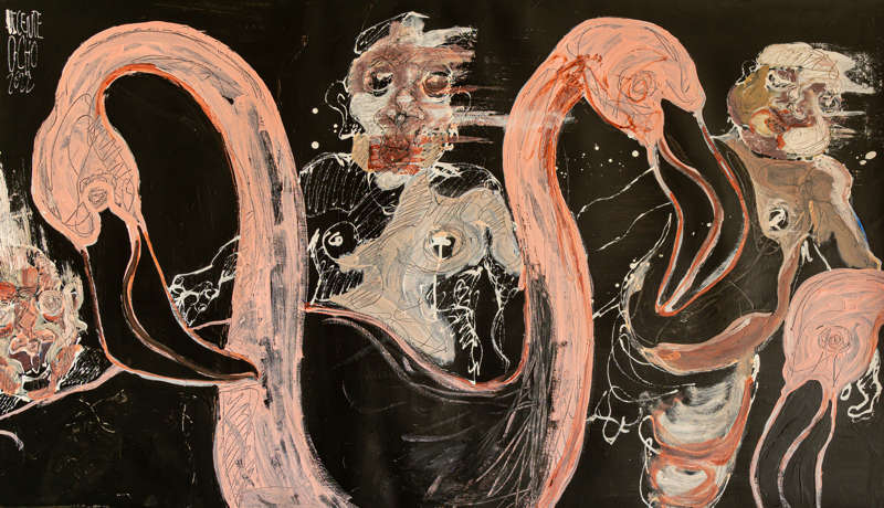 Je suis un artiste autodidacte, argentin né à Mendoza et vivant à Paris depuis quelques années. La principale caractéristique de mon travail est le mélange viscéral et chaotique entre le dessin et la peinture, au service d’une recherche psycho-artistique qui tente de représenter comment l’être humain vit l’hystérie de la psyché et ses transmutations dans l’expérience de la réalité.