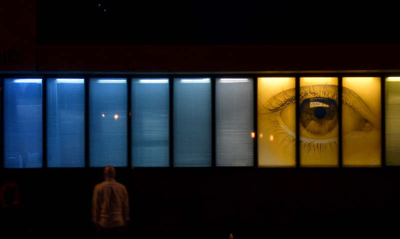 La face architecturale devient avec les films photographiques interface entre l’espace intérieur et extérieur. Un œil fermé, un œil ouvert, liés par un dégradé de couleurs, se déploient sur toute la longueur de la façade vitrée. La lumière du jour illumine les images de l’extérieur vers l’intérieur du CDI, la nuit, le dispositif de lumières artificielles éclaire les images de l’intérieur vers l’extérieur, à l’instar d’un caisson lumineux.