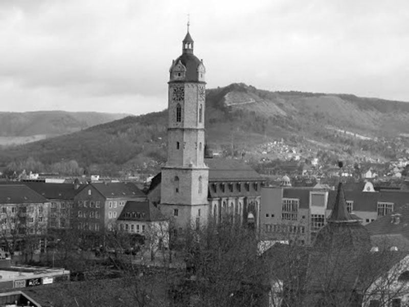 Des collines douces enserrent la cité de Iéna, font de la ville entière un lent étagement, la bordent du vert et du lointain des arbres, tout autant que l’hiver les vallons enneigés en ouatent les pourtours sur les cartes postales et sur les dépliants touristiques de Thuringe, où trône, improbable et arrondie comme un reflet de minéral et d’acier, la tour moderne et bleutée de Jentower.
