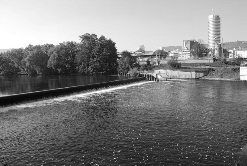 Passée, en haut, la silhouette de ruine préservée de la petite poudrière médiévale des anciens remparts, la Pulverturm, avec son air et ses créneaux effondrés de maquette et de château fort miniature, à un détour des ruelles revenant dans la Kollengiengasse, se présente le diptyque involontaire de la ville et du temps. S’offrent brusquement au regard l’évidence et l’étrangeté de la cité de Iéna. Les années ont forgé ces deux étranges moitiés juxtaposées d’un impossible et géant sablier. Sur notre côté, à gauche, se dresse dans son jet soviétique des années 1970 la Jentower, haute tourelle de verre et de métal luisant, avec à sa base une galerie marchande, et arborant dans son élan vers le ciel une sorte aussi de fin liseré, d’abord imperceptible, puis montant en oblique à l’instar d’une moderne, rêvée et laborieuse tour de Pise de métal et de verre. N’exhibant cependant nulle arête franche, semblant plutôt se refermer sur elle-même en quelque tension interne d’ombilic retenu, et brisant, dans les courbes de son cercle rêvant, dans sa lumière réfléchie et bleutée, les angles des rues tout autour (jusqu’à l’écho et l’image d’autres tours dans notre esprit, la tristesse pesante et un peu funéraire d’une tour Montparnasse à Paris ou d’une tour Bretagne à Nantes), la Jentower miroite aussi dans Iéna comme un bloc solidifié de simple pacotille, signant un étrange et tardif « soviétisme neuf », s’alignant sur d’involontaires et internationaux Sofitel ou Ibis, récents, et aux façades d’un instant.