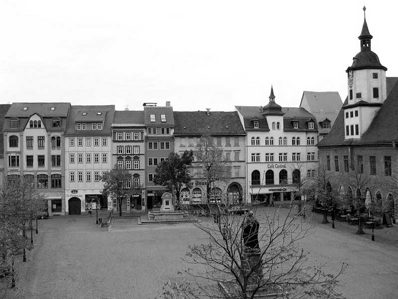 Il y a une sorte de nimbe des mythes dans les mots, entre l’écriture parfois, l’image qu’ils font dans notre esprit et leur sonorité. À Iéna, le nom de la cité en français se dissout dans l’orthographe allemande qui en ferait un adouci Jena, avec l’hésitation un instant de lire un gé pour la première syllabe, enlevant à tout un passé sa sorte de nerf et de batailles supposées, les couleurs d’une histoire, les uniformes militaires, puis retrouvés brusquement dans l’évidence du yé corrigé par l’esprit et prononcé enfin, repris, dans un lointain yod oublié en tête de Jena. Et Iéna ne joint pour moi que par là l’évocation de la Place de Iéna à Paris, le pont, l’avenue près du Trocadéro, l’impression et l’histoire de ces guerres dites napoléoniennes, avec leurs pans de jouets d’enfants grandis, à la fois désuets et claquants, comme l’effort et l’étrangeté de deux armées affrontées puis changées en des soldats peints dans leur destin advenu d’un conte de Grimm ou d’Andersen, les plans à l’encre noire délavée, les reconstitutions, les plaines, les vallons et les uniformes. Et si je n’ai pu ignorer les panneaux, les images, les dépliants signalant ces batailles autour de Iéna ni le scintillement des noms de la Prusse et de Napoléon, nulle matière pour eux ni aucune substance ne flottent en réalité pour nous dans les interstices de l’air à Iéna, entre la vieille université, la maison de Fichte, la Marktplatz médiévale, l’ancien Rathaus ni, plus loin, la vieille église Saint-Michel.